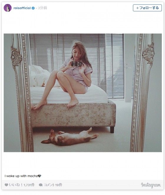 ローラと、そのそばで仰向けになった愛犬モカの姿が。寝起きとばかりにローラの髪は少し乱れており、パジャマのショートパンツから長い美脚を大胆にのぞかせている。
