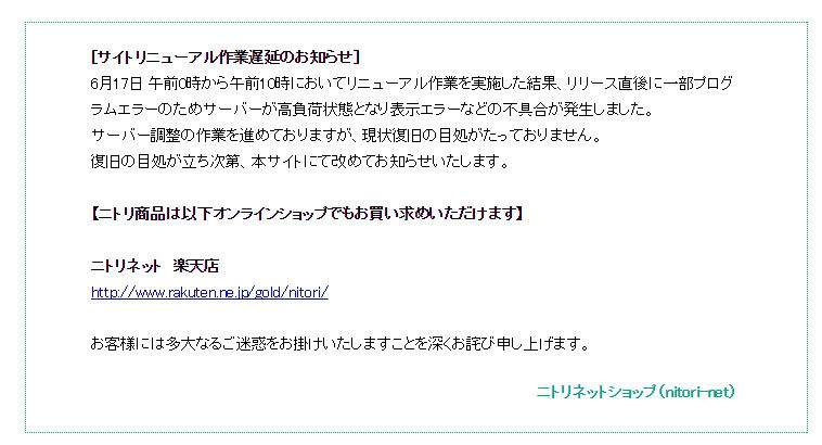 引用元: ・【お値段異常】ニトリのウェブサイトがサイトリニューアル大失敗! 不具合発生で5日経っても復旧せず