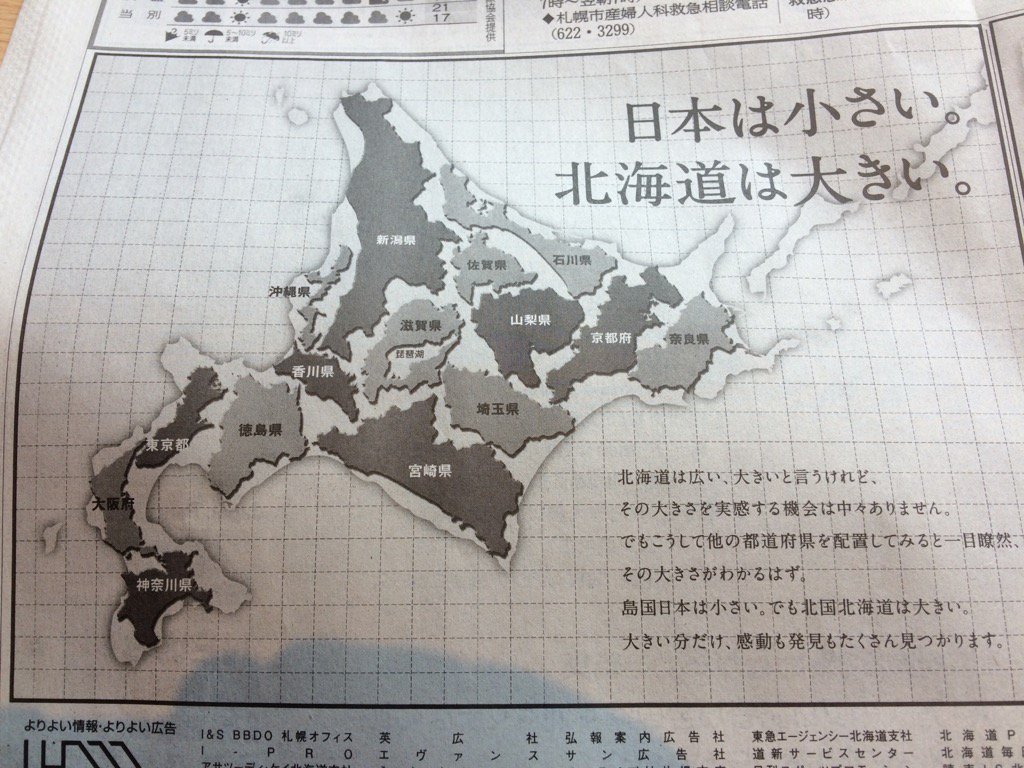 北海道の大きさを実感できる。ある新聞に掲載された広告が「スゴイ!」と評判を集めている。気になるその内容は?