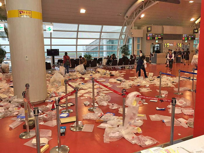 ・中国人が去ったあとの済州国際空港のロビーがゴミの山