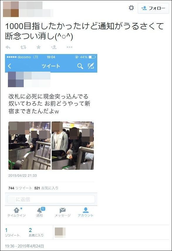 引用元: ・【バカッター】まんこが盗撮「こいつ痴漢。拡散して家庭ぐちゃぐちゃにしたい」と晒す→炎上→会社バレ