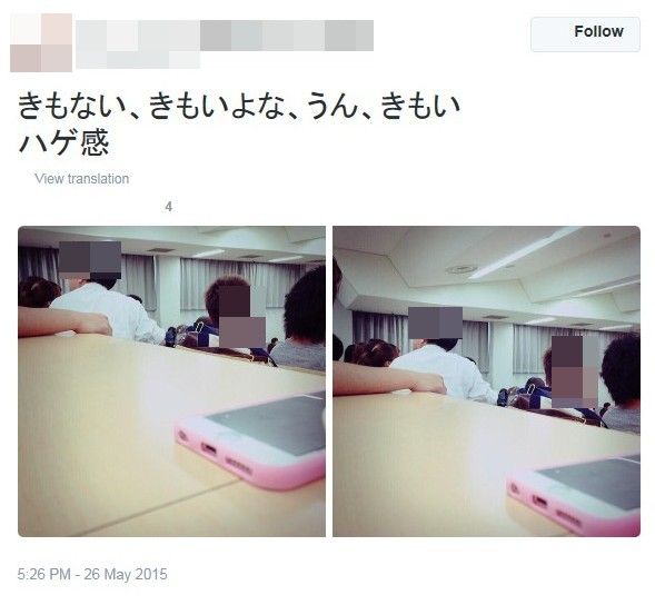 女性の尻の下に手を入れてきたという。「本当にあり得ないので写真晒すね」、「こいつ結婚指輪してるし。死ね」。