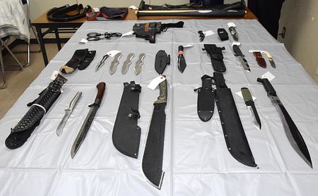 志賀弘明容疑者(28)を現行犯逮捕した。同容疑者は計14本の刃物を腰につって、