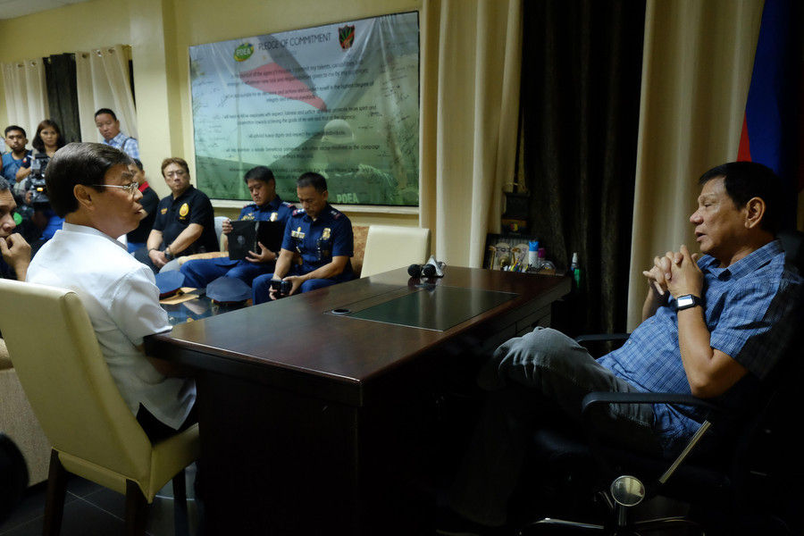 フィリピン南部ダバオの麻薬取締局で面談するロドリゴ・ドゥテルテ大統領(右)と実業家のピーター・リム氏(左、2016年7月15日撮影、公開)。【翻訳編集】 AFPBB News拡大写真