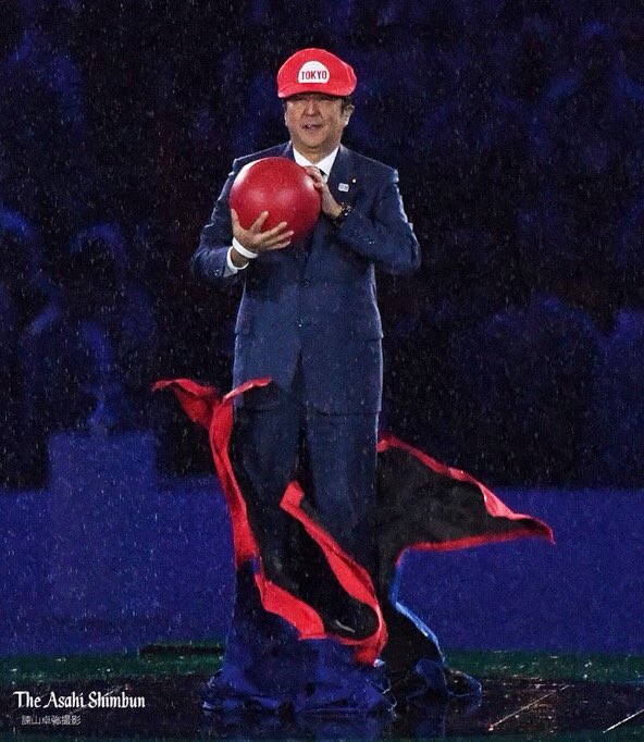 五輪閉会式に出席した後、自ら人気ゲームのキャラクター「マリオ」に扮(ふん)し登場した