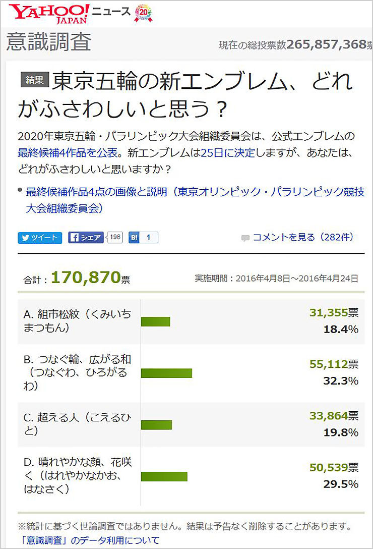 引用元: ・【炎上】東京五輪エンブレム「国民投票で最下位の案」に決定で国民激怒 /元審査員も疑問「A案ありき」